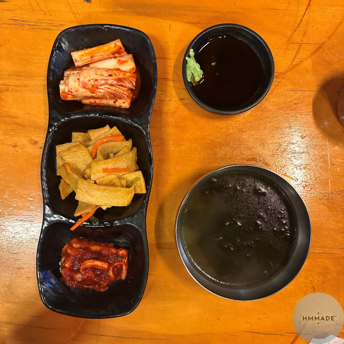 3명이서 한 테이블을 썼고 시킨 음식은 오징어 볶음, 고등어 구이 그리고 삼치구이입니다. 찌개를 따로 시키지 않으면 미역국이 나와요. 그리고 생선구이를 찍어 먹을 수 있는 간장과 와사비가 식탁에 준비되어 있어요.